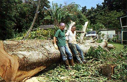 Andy Parker (left) and Wayne just after Wayne felled a Mango tree in the yard of one of Andy's clients. The trunk was 14 feet to the first crotch and 3 feet average diameter, full of gorgeous curly grain. Many very nice bowls came out of this. Andy is an exceptional craftsman of fine furniture, working in Koa as well as other woods. He can be reached at (808) 639-0385 |